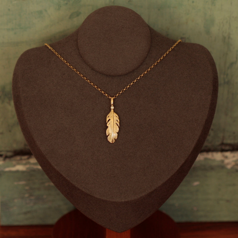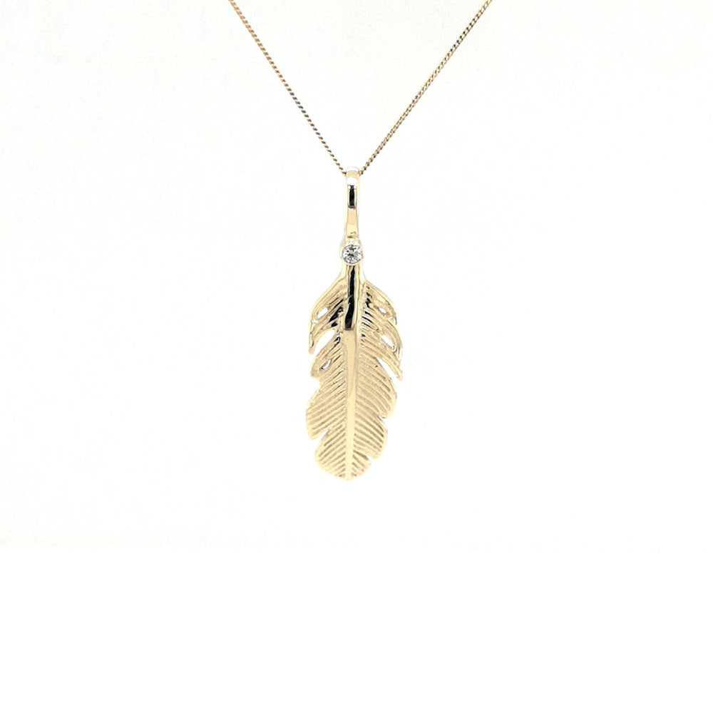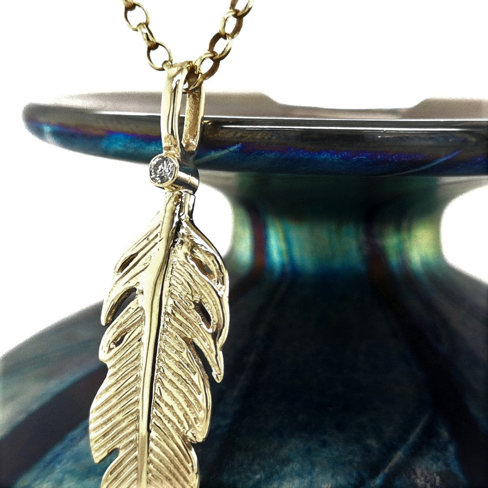 Diamond feather necklace handcrafted in solid gold, beautiful feather detail on the front and back, sways from either a sturdy slim gold chain or a thicker 9ct gold belcher chain.