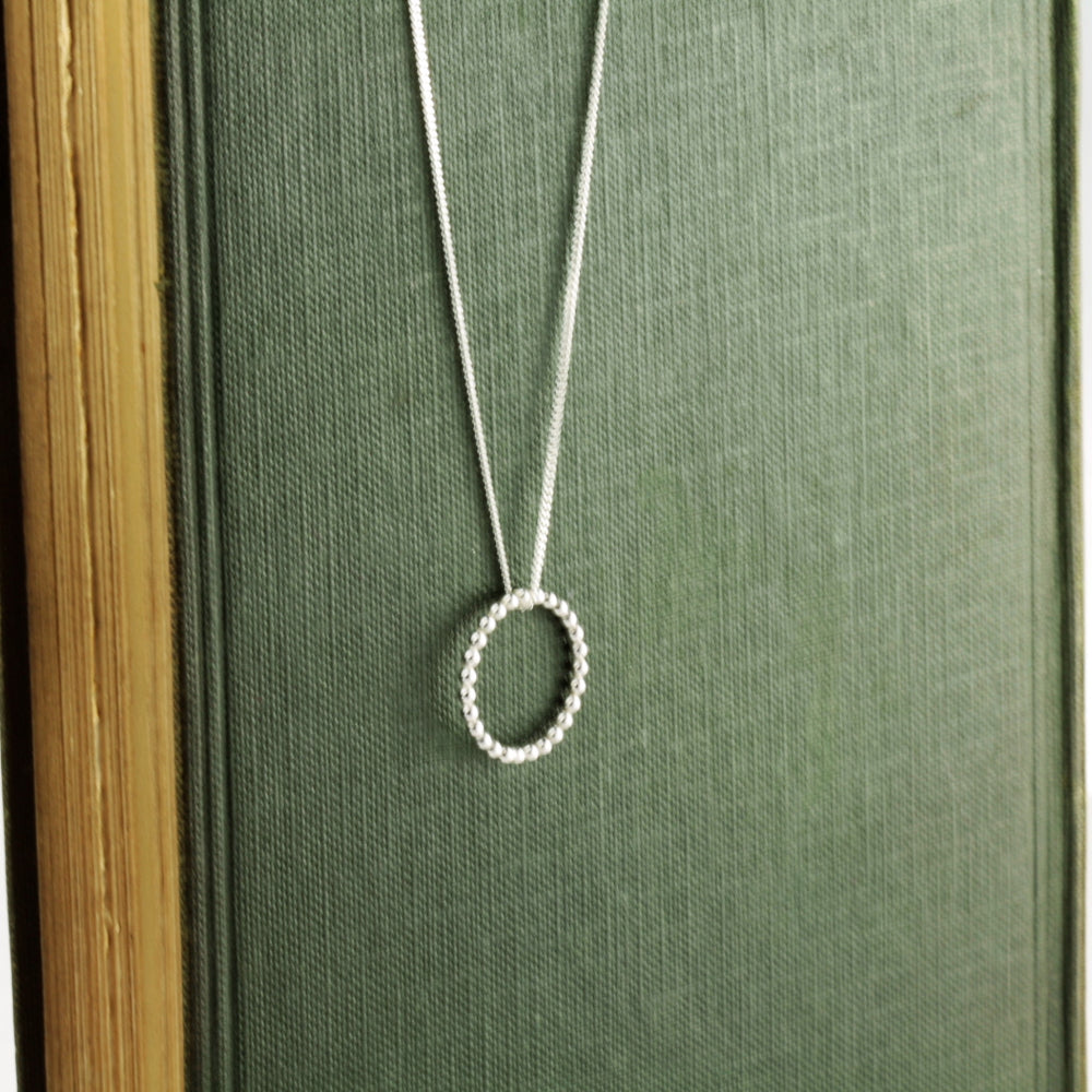 Handmade silver round pebble pendant and sways from a sterling silver chain