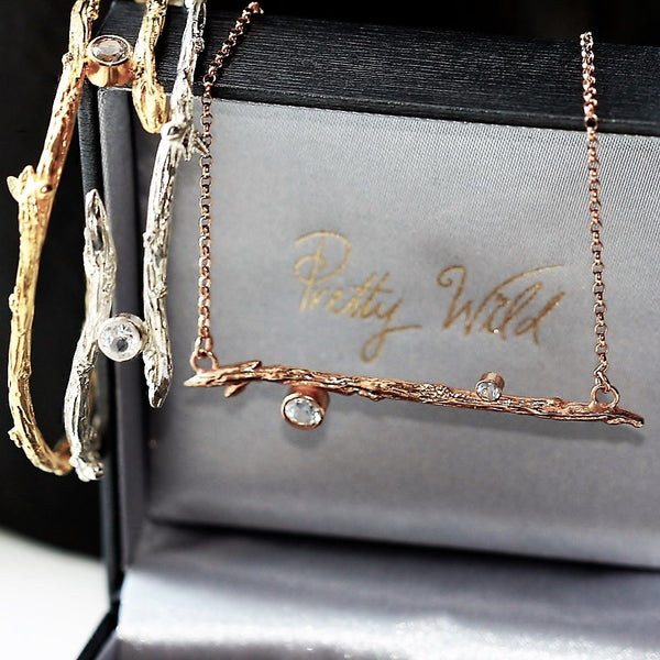 Handmade silver and gold unusual twig jewellery, personalized whimsical letters, twig crosses, twig rings, bespoke twig bangles, bracelets and earrings featuring gemstones and diamonds.