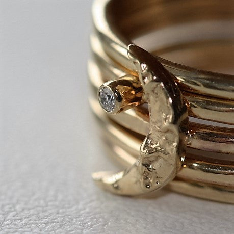 A set of stunning handmade solid gold moon and diamond stacking rings, the moon has a unique texture, with three tubes set sparkling diamonds and one gold spacer ring